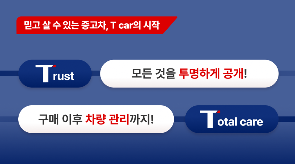 T car는 단순히 ‘중고차를 판다’는 개념을 넘어서, "믿을 수 있는 품질(Trust)과 끝까지 책임지는 관리(Total Care)"라는 두 가지 가치를 바탕으로 한 새로운 중고차 브랜드예요.