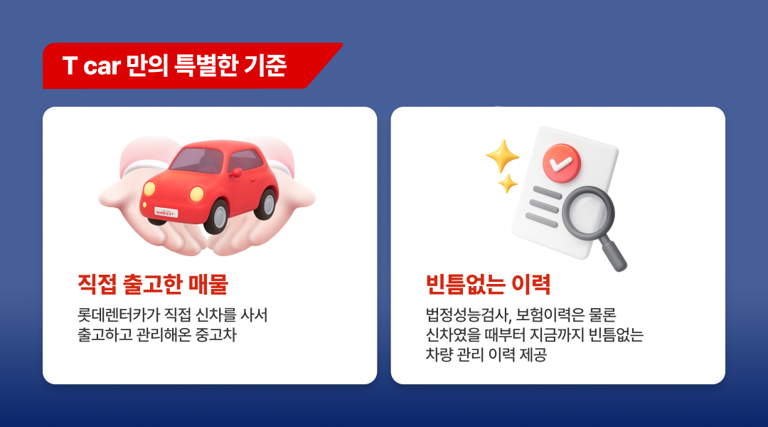 T car는 롯데렌터카가 직접 신차로 구매하고 철저히 직접 관리해온 차량만 판매해요