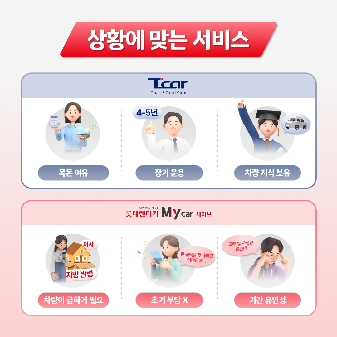 오늘은 롯데렌탈의 중고차 브랜드인 T car(중고차 구매)와 롯데렌터카 마이카 세이브(중고차 장기렌트)를 초기 비용·예산관리·기간 유연성·정비/관리 관점에서 쉽게 비교해 드릴게요✨