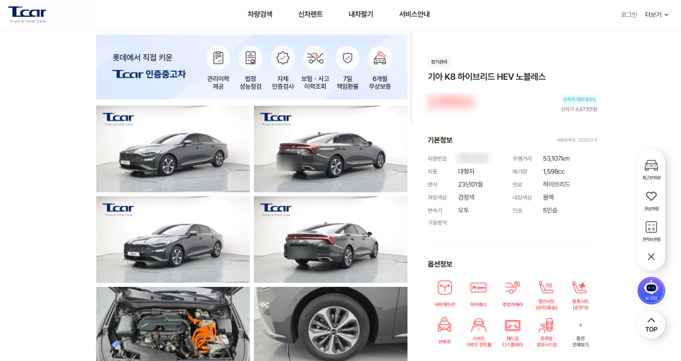 고객님께서 말씀해 주신 것처럼 '사진과 똑같은 실물', **'숨김없는 차량 설명'**은 T car가 가장 중요하게 생각하는 원칙입니다. 꼼꼼하게 따져보고 고르신 만큼, 고객님의 소중한 발이 되어 오랫동안 안전하게 달려주리라 확신합니다.