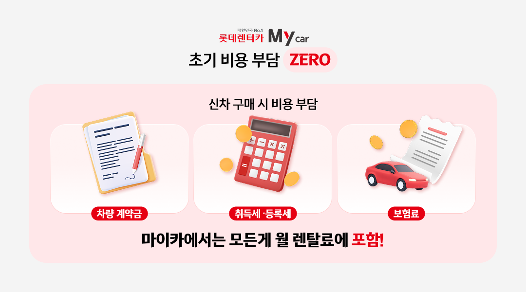 하지만 롯데렌터카 마이카는 큰 초기 비용 없이 월 대여료만으로 차량 이용이 가능해 초기 비용 부담 없이 원하는 차를 타볼 수 있어요!
