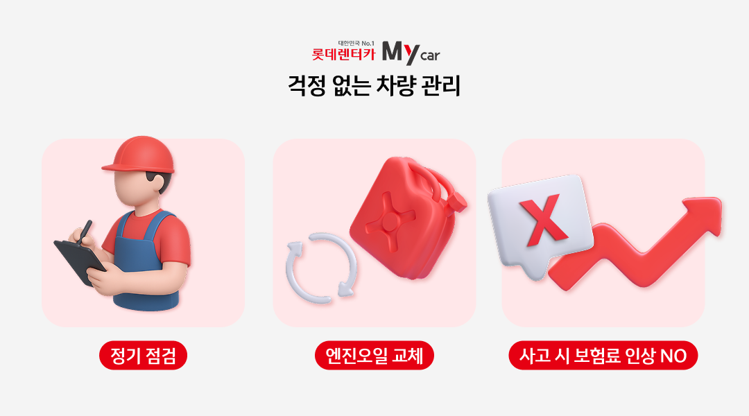 무료 엔진오일 교체부터 타이어 체크, 배터리 점검까지 롯데렌터카가 주기적으로 관리해주는 케어 서비스로 걱정 없이 탈 수 있어요.