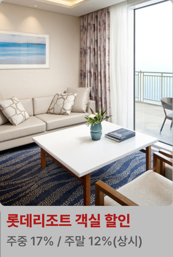 | 롯데리조트 | 상시 객실 할인 (주중 17%, 주말 12%) | 상시 객실 할인 (주중 17%, 주말 12%) | 상시 객실 할인 (주중 17%, 주말 12%) 제주 아트빌라스 주중 1박권 1매 |